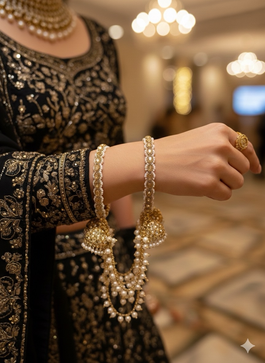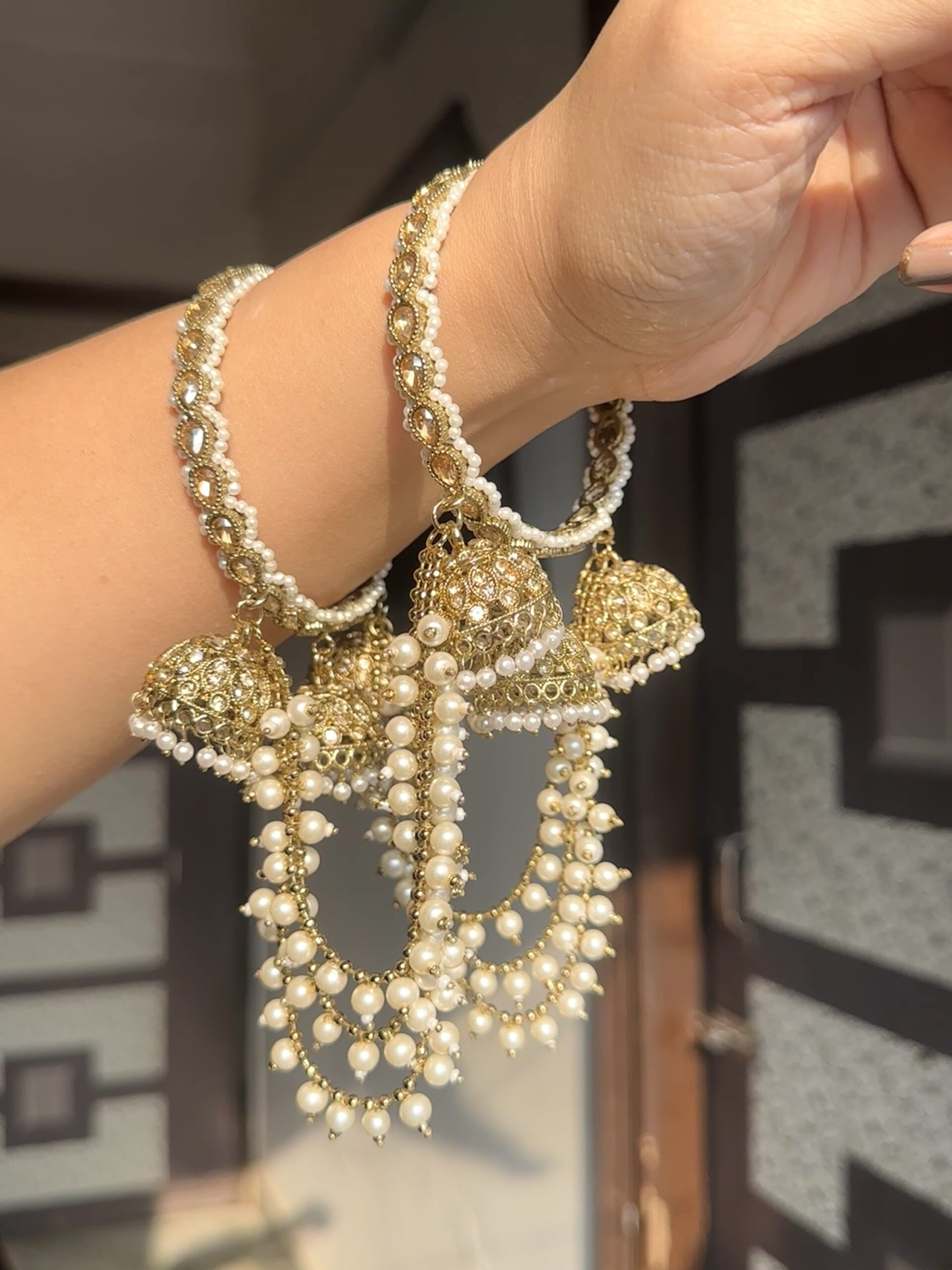 Antique Gold bangles with 3 jhumka latkans with pearl chains hanging from both end bangles. Add your existing bangle stack in the middle to add more drama to your look! Sold as single. Buy 2 if needed for both arms.