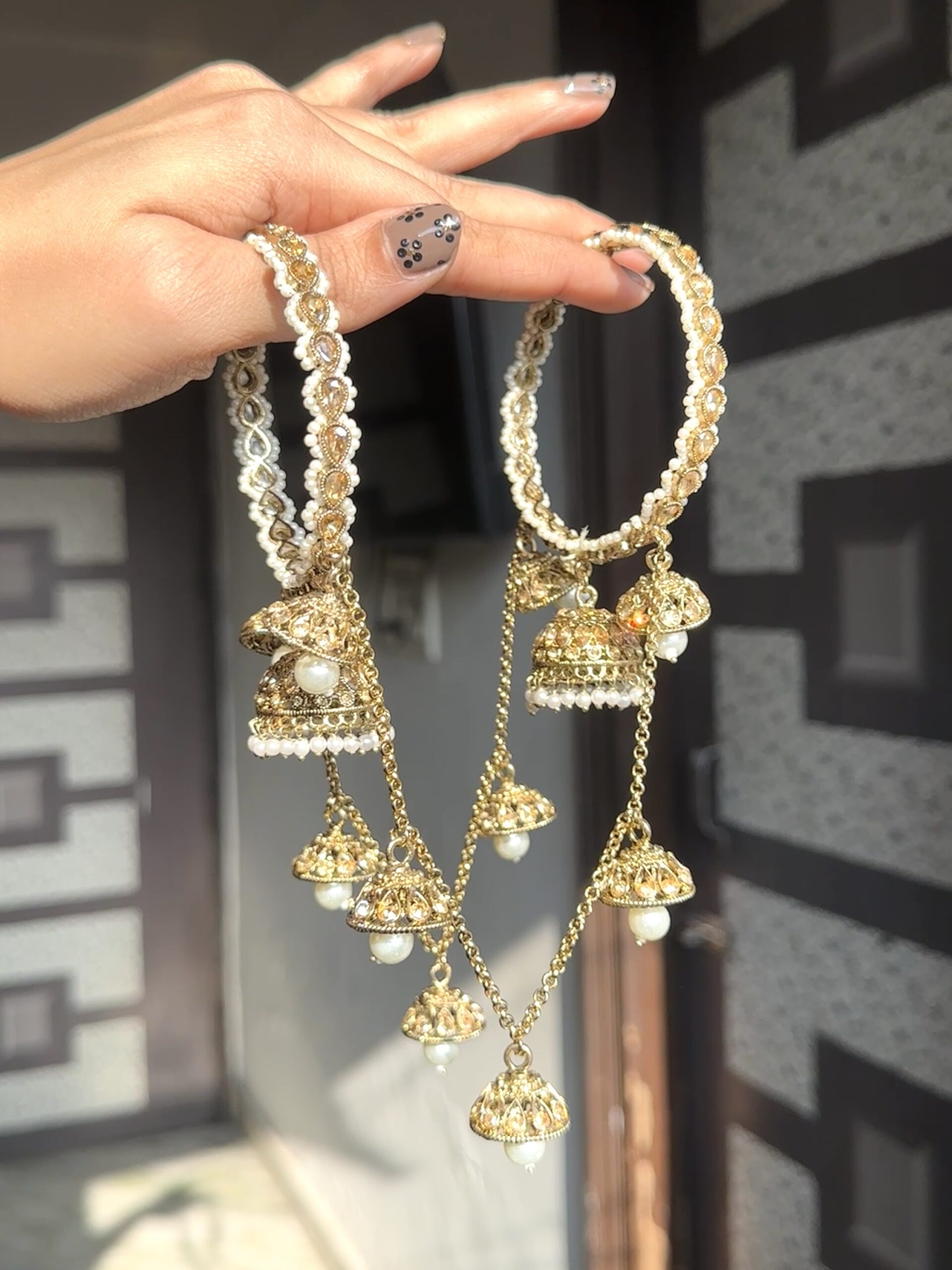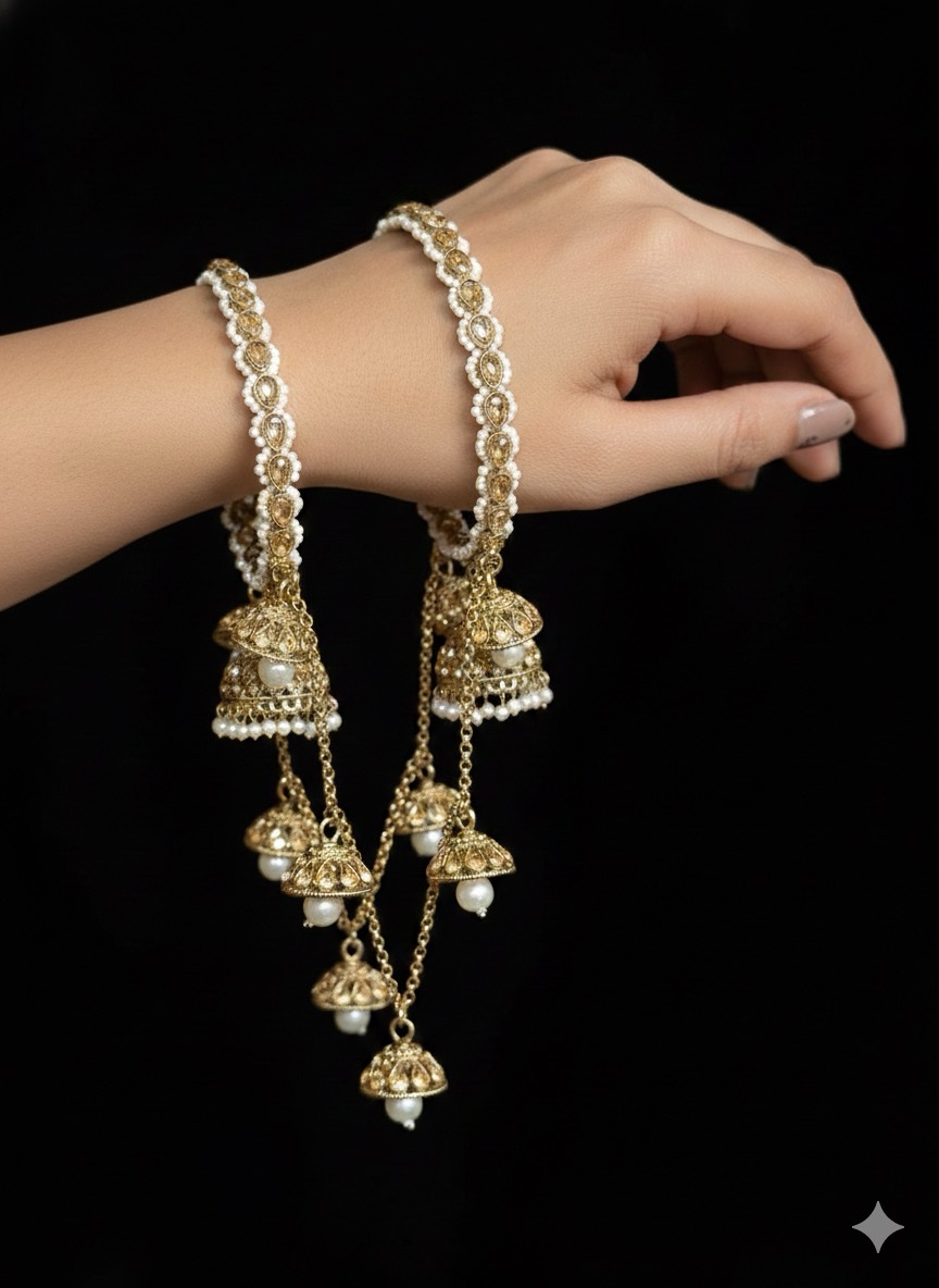 Antique Gold bangles with jhumka chains hanging from both end bangles. Add your existing bangle stack in the middle to add more drama to your look!