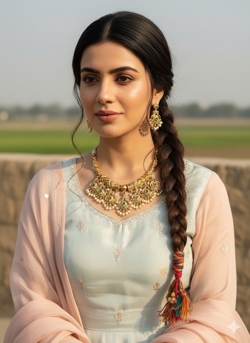 Introducing our Gold Plated Punjabi Indian Style Bib Necklace Set. Crafted on a base of high-grade alloy metal, this set beautifully captures the essence of Punjabi heritage jewellery , infusing it with modern elegance for a timeless and sophisticated look.
