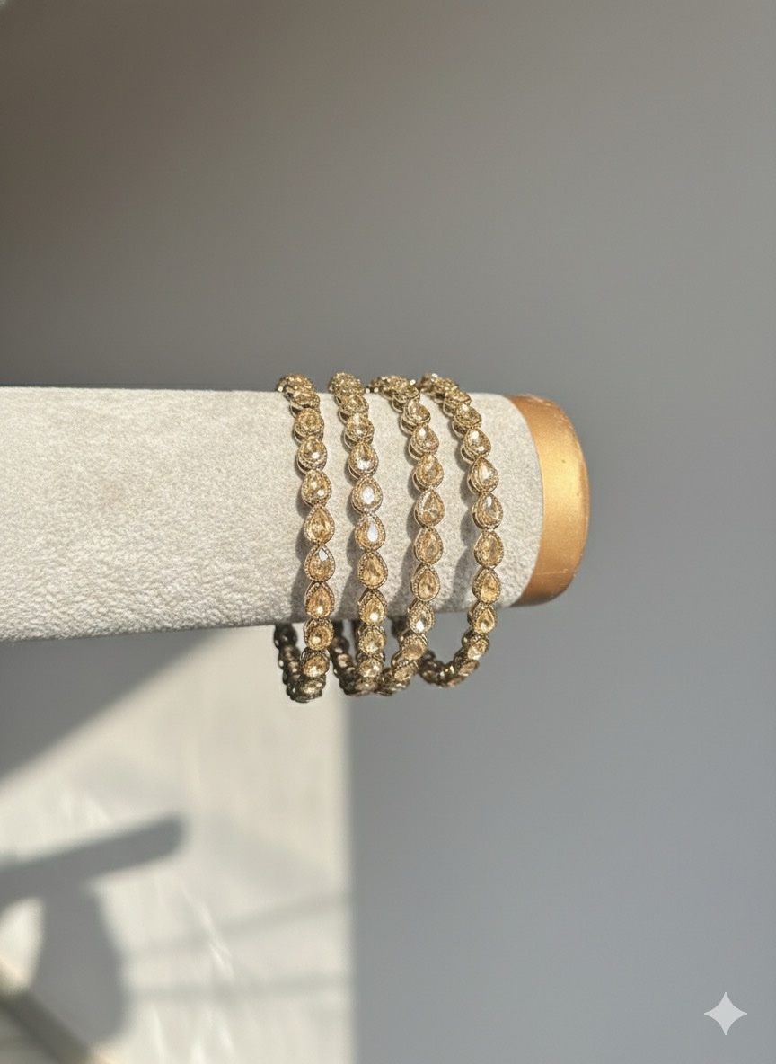 Presenting Our 4-Piece Antique Gold-Tone Bangle Set. Elevate your ethnic charm with our exquisite 4-piece antique gold-tone bangle set, elegantly studded with simulated Polkis. Crafted from high-grade alloy metal, these bangles combine traditional craftsmanship with timeless beauty. Perfect for any occasion from festive celebrations to weddings or casual ethnic wear—this set adds a regal touch to your ensemble.