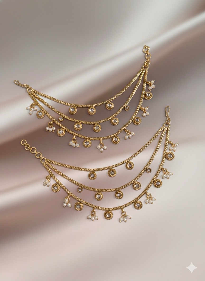 This hair accessory is crafted from premium-grade metal with an antique gold finish and polki stones. This kaan chain is a must-have for every Indian fashion girl. Style it with lehengas, sarees and suit sets for festive occasions and weddings.