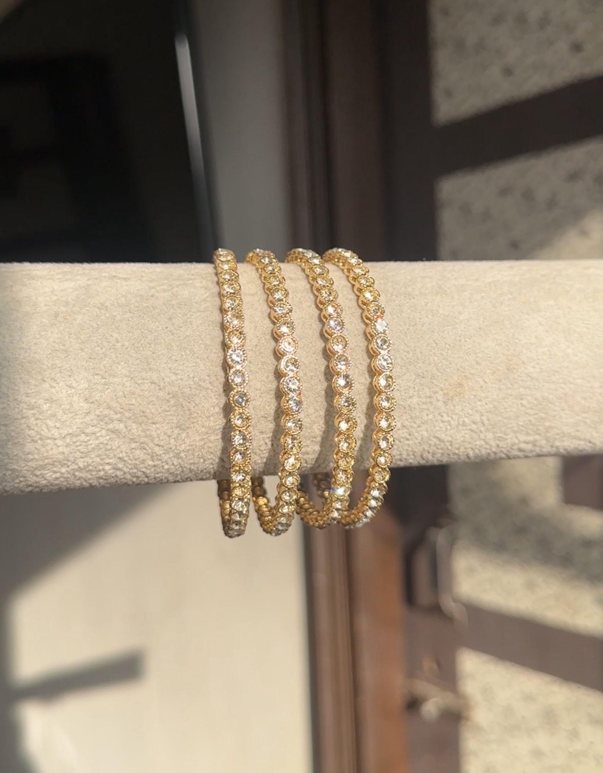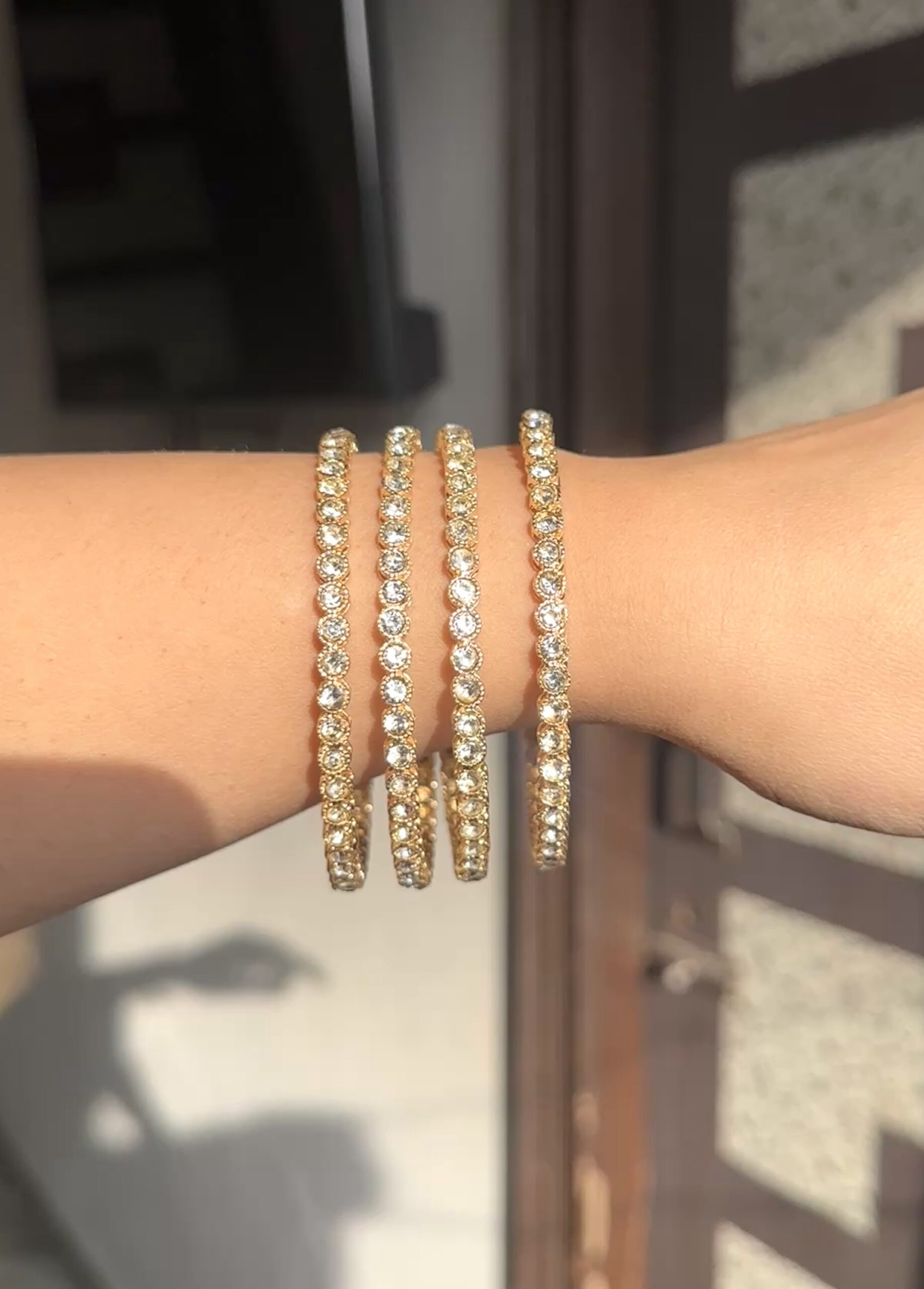 Elevate your ethnic ensemble with this exquisite 4 PC American Diamond Bangle Set. Crafted on a base of high-grade alloy metal, gold plated for long stay polish, these bangles are a perfect blend of traditional charm and contemporary elegance.