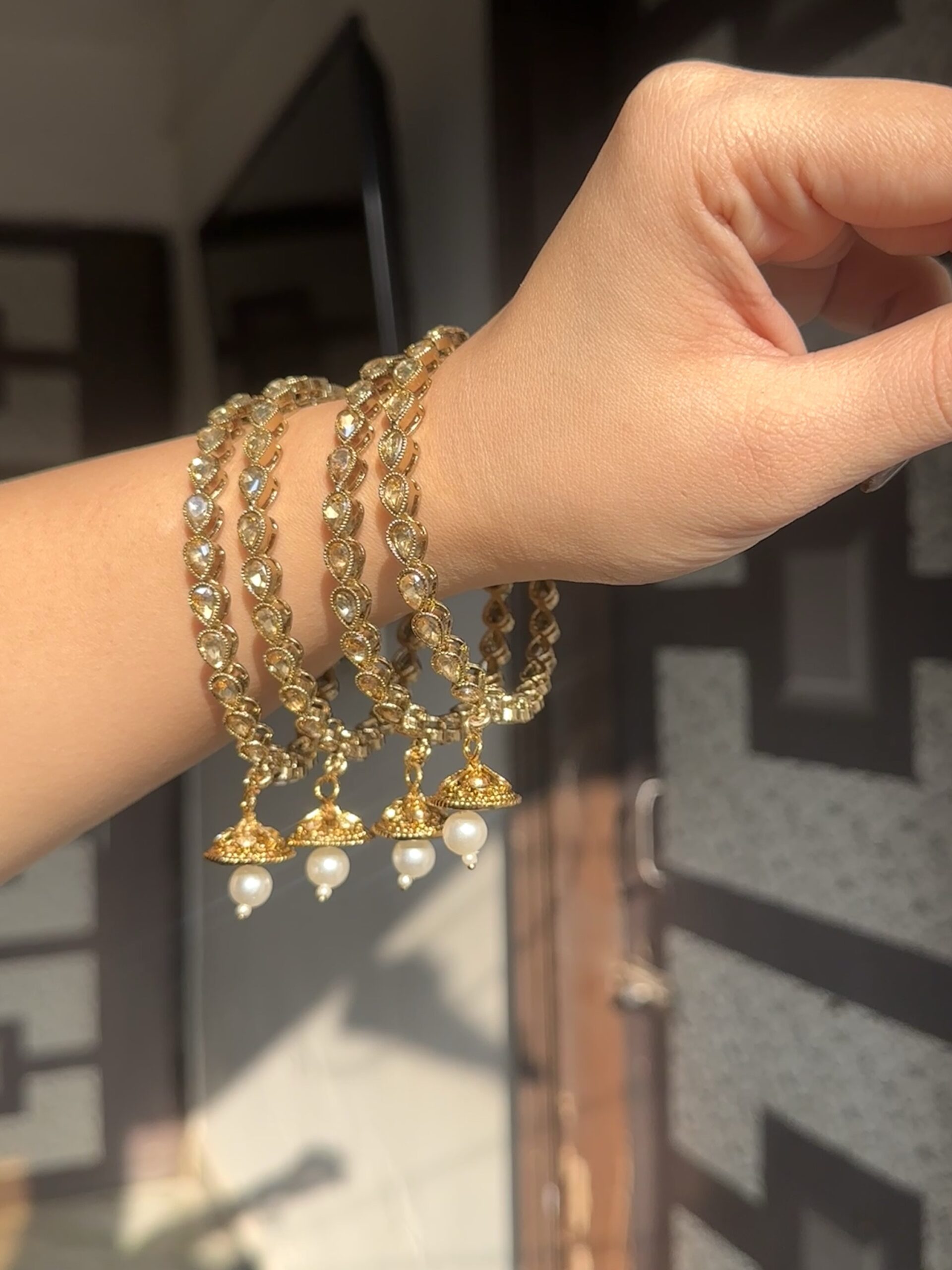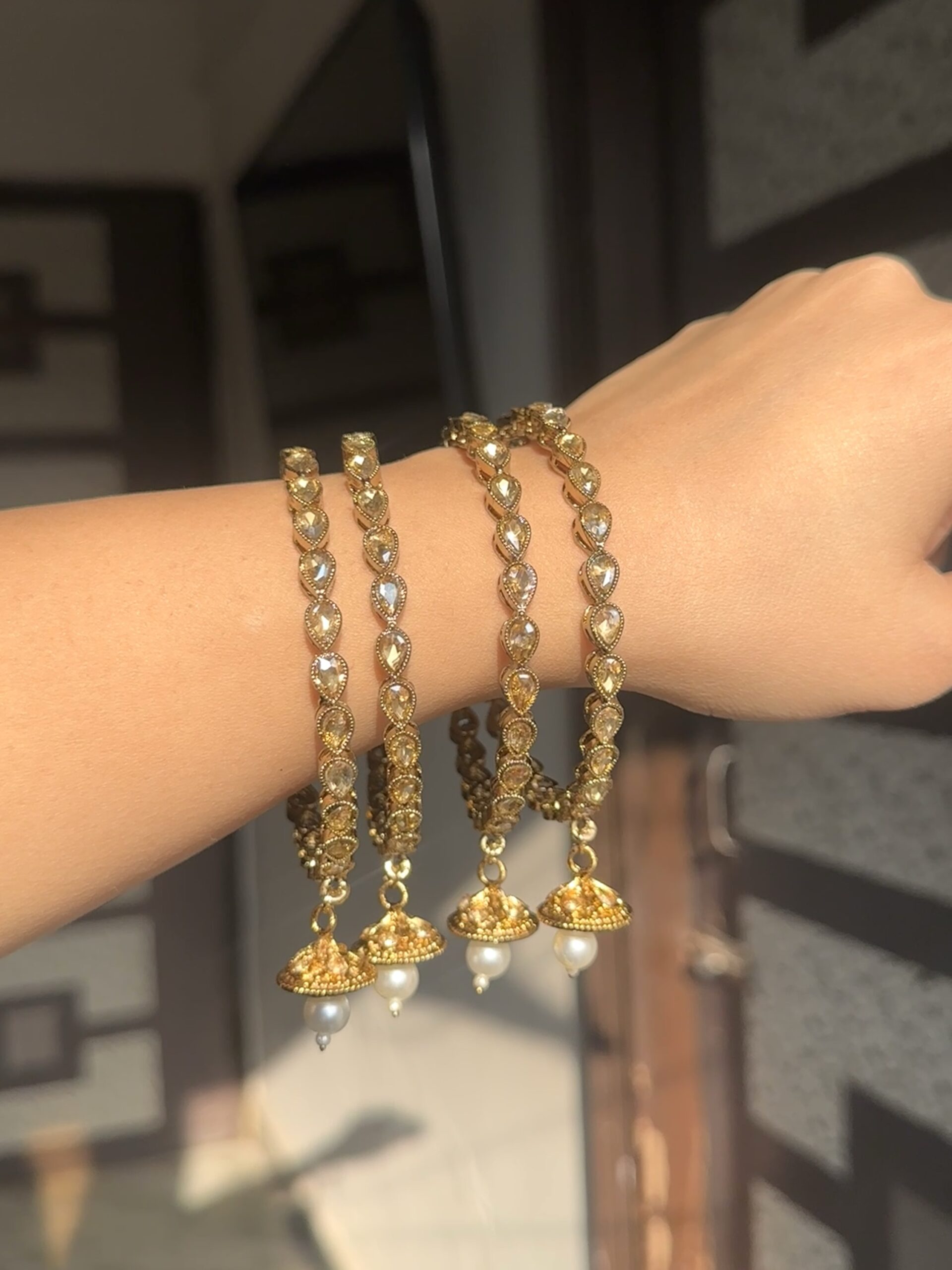 Set of Antique Gold hand made bangles crafted sparkling champagne polki stones with pearl drops jhumki.