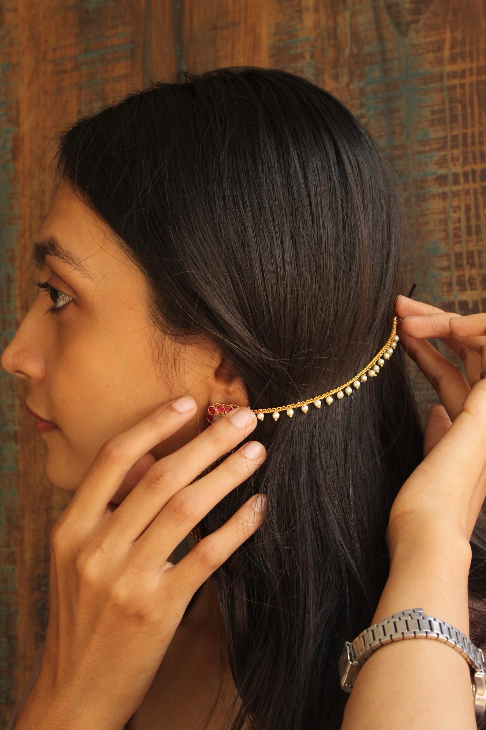 Gold Plated Brass lightweight 1 Line Earchain with Handcrafted Brass Work & pearls