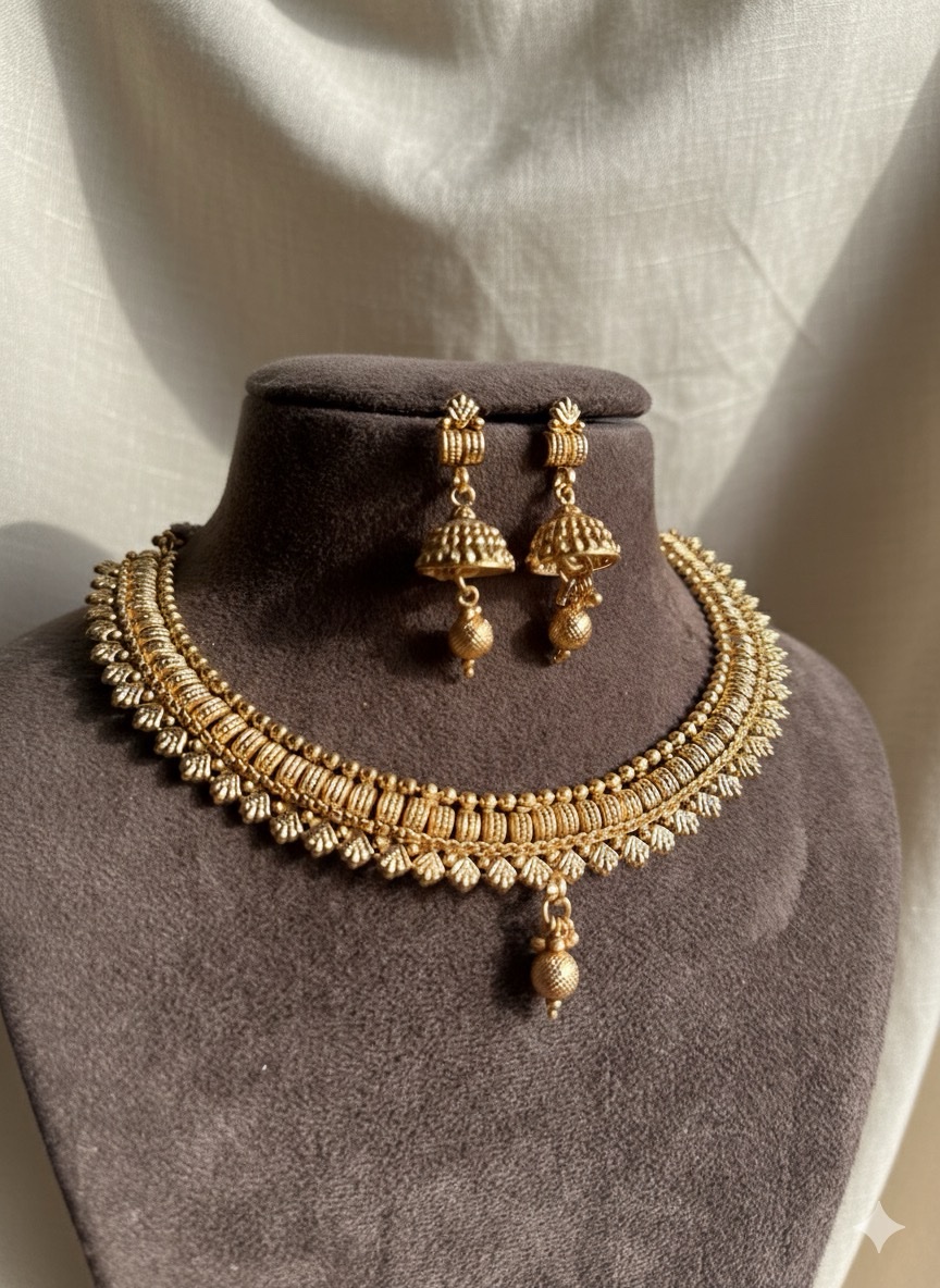 Introducing our Gold Plated South Indian Style Bib Necklace Set Crafted on a base of high-grade alloy metal, this set beautifully captures the essence of south indian jewellery , infusing it with modern elegance for a timeless and sophisticated look.